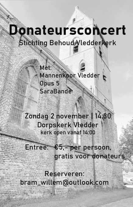Donateursconcert met Mannenkoor Vledder, Opus 5 en SaraBande. In samenwerking met Stichting Behoud Vledderkerk.